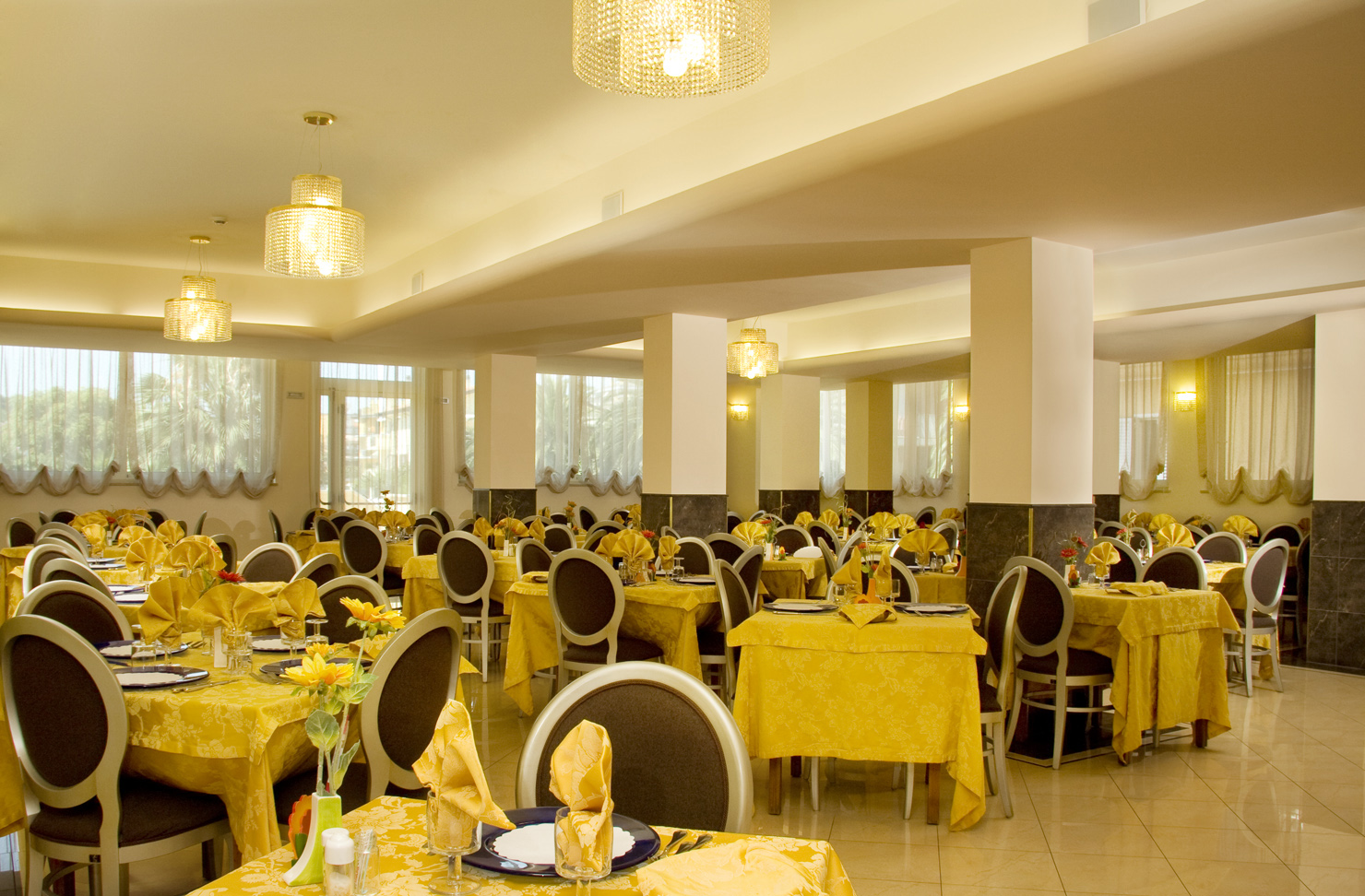 La sala da pranzo ampia ed elegante è il punto nevralgico della vita dell'hotel con cucina ricca di specialità tipiche ed internazionali con possibilità di scelta tra vari menù preparati con materie prime di alta qualità.