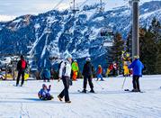 • Sciatori nelle ampie piste da sci di Folgarida in una giornata di sole
